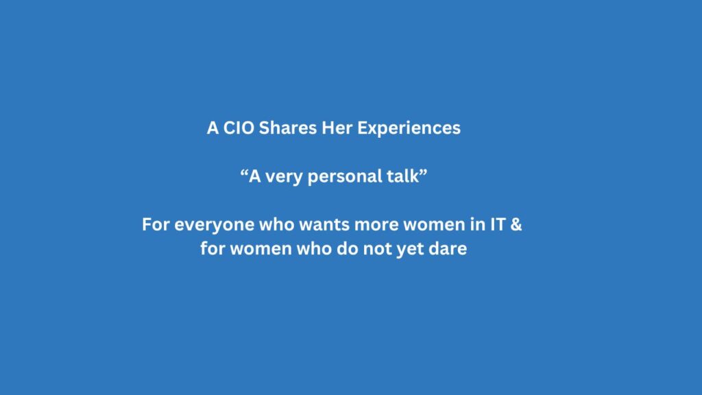 The presentation guides us through Petra’s personal practice to obtain a CIO, it is female specific but also caters for those male senior leaders who want to employ more women in IT, and the guidelines on how to achieve it.